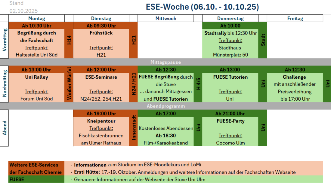 Die ESE findet in der Regel in der Woche vor Beginn des Semsters statt. Damit du immer auf dem aktuellsten Stand bist, empfehlen wir dir, uns in den sozialen Medien zu folgen und regelmäßig deine Mails zu checken.